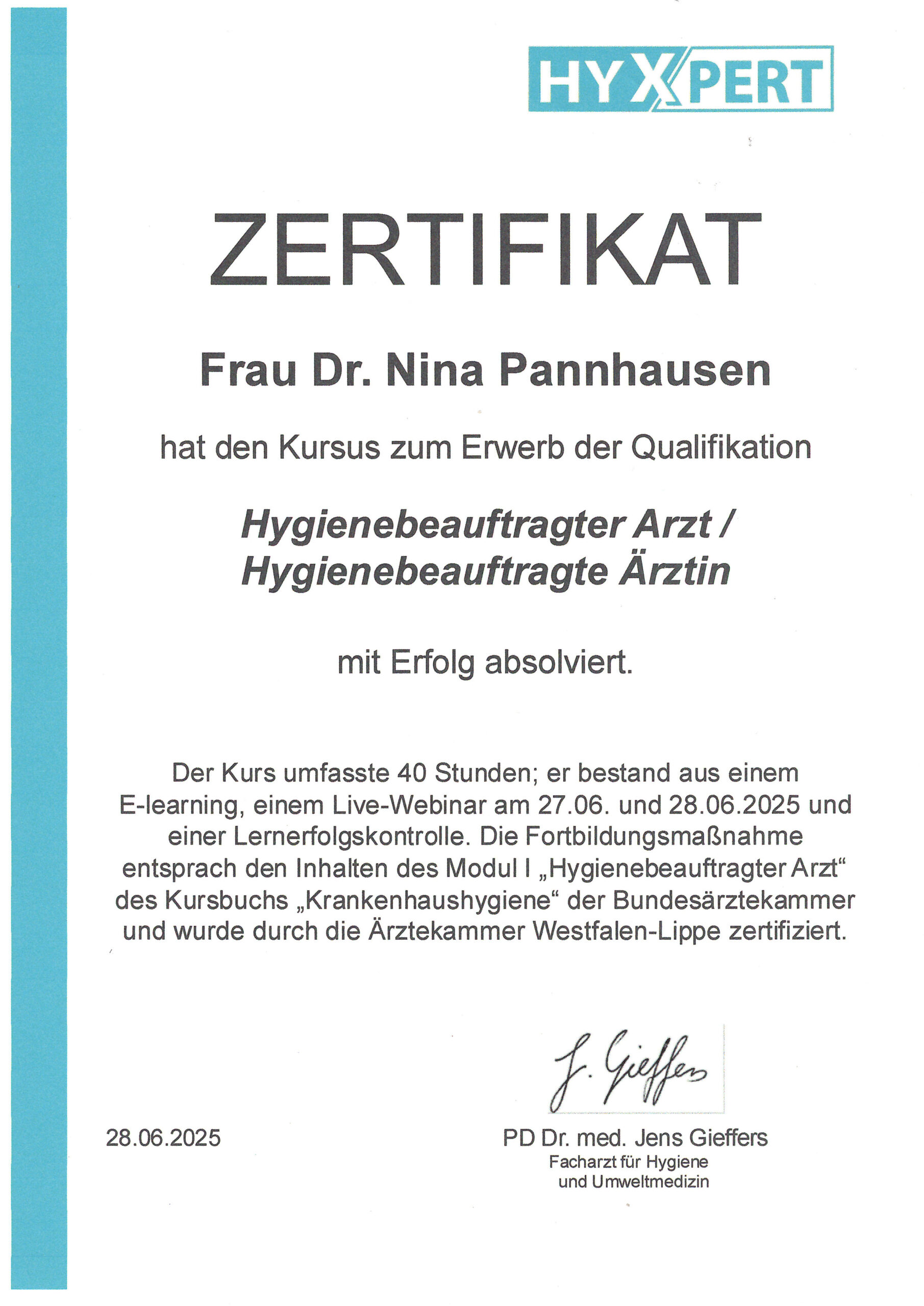 Zertifizierung und Erwerb der Qualifikation zur „Hygienebeauftragten Ärztin“ (entsprechend den Inhalten „Hygienebeauftragter Arzt“ des Kursbuchs „Krankenhaushygiene“ der Bundesärztekammer und durch die Ärztekammer Westfalen-